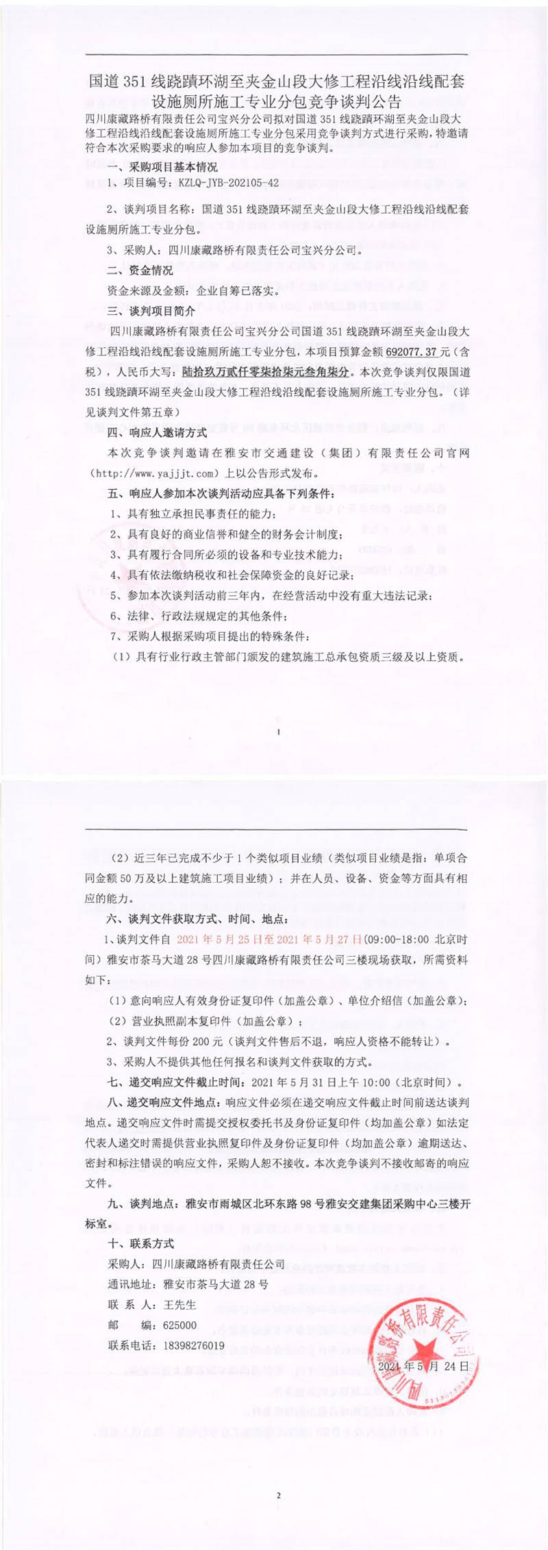 四川康藏路橋有限責任公司寶興分公司國道351線蹺磧環(huán)湖至夾金山段大修工程沿線沿線配套設(shè)施廁所施工專業(yè)分包競爭談判公告