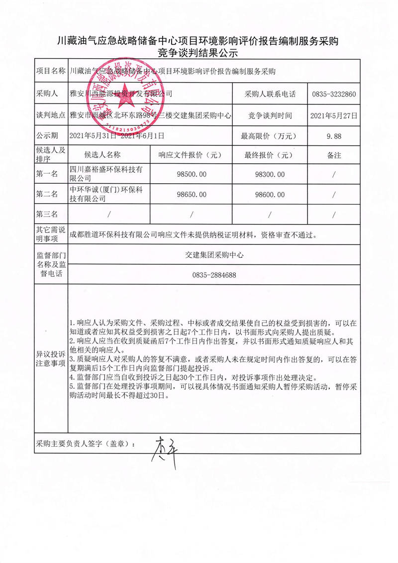 雅安川西能源投資開發(fā)有限公司川藏油氣應(yīng)急戰(zhàn)略儲備中心項(xiàng)目環(huán)境影響評價報告編制服務(wù)采購競爭性談判結(jié)果公示
