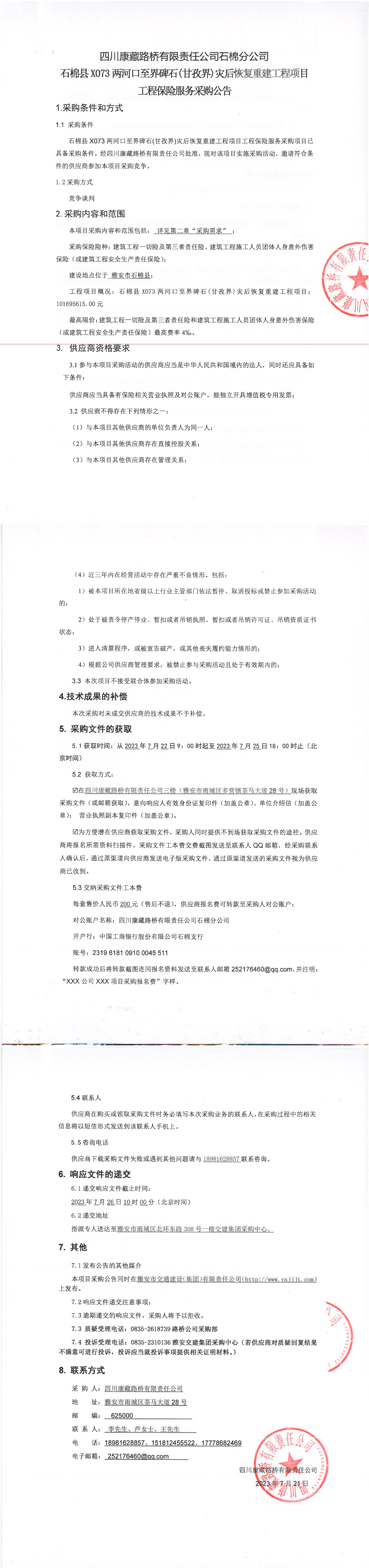 四川康藏路橋有限責(zé)任公司石棉縣X073兩河口至界碑石(甘孜界)災(zāi)后恢復(fù)重建工程項目工程保險服務(wù)采購公告