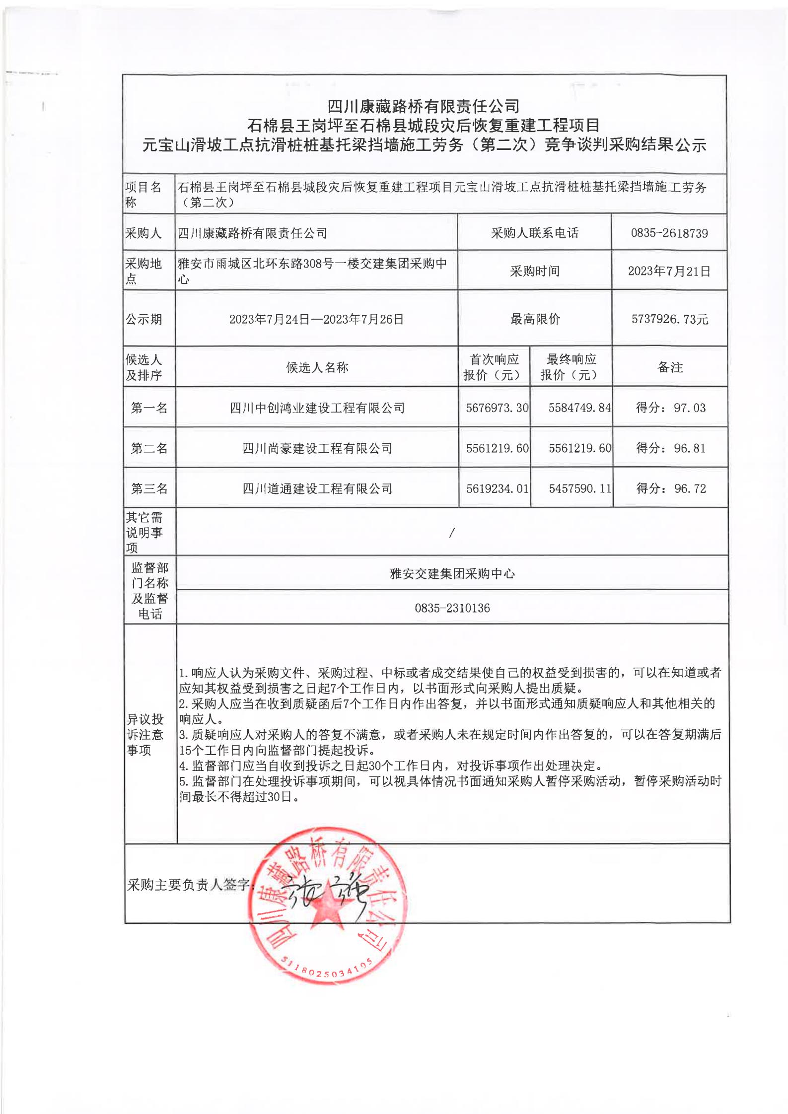 四川康藏路橋有限責任公司石棉縣王崗坪至石棉縣城段災后恢復重建工程項目元寶山滑坡工點抗滑樁樁基托梁擋墻施工勞務(第二次)競爭談判采購結果公示