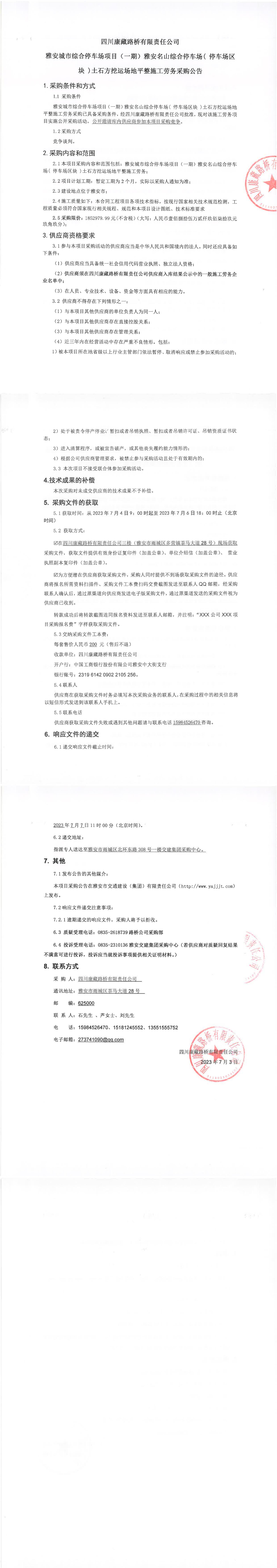四川康藏路橋有限責(zé)任公司雅安城市綜合停車(chē)場(chǎng)項(xiàng)目(一期)雅安名山綜合停車(chē)場(chǎng)(停車(chē)場(chǎng)區(qū)塊)土石方挖運(yùn)場(chǎng)地平整施工勞務(wù)采購(gòu)公告