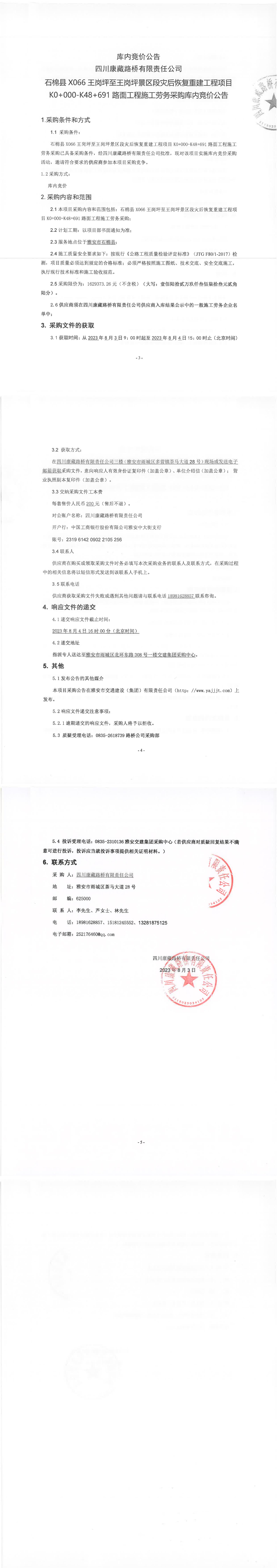 四川康藏路橋有限責(zé)任公司石棉縣X066王崗坪至王崗坪景區(qū)段災(zāi)后恢復(fù)重建工程項(xiàng)目K0+000-K48+691路面工程施工勞務(wù)采購(gòu)庫內(nèi)競(jìng)價(jià)公告