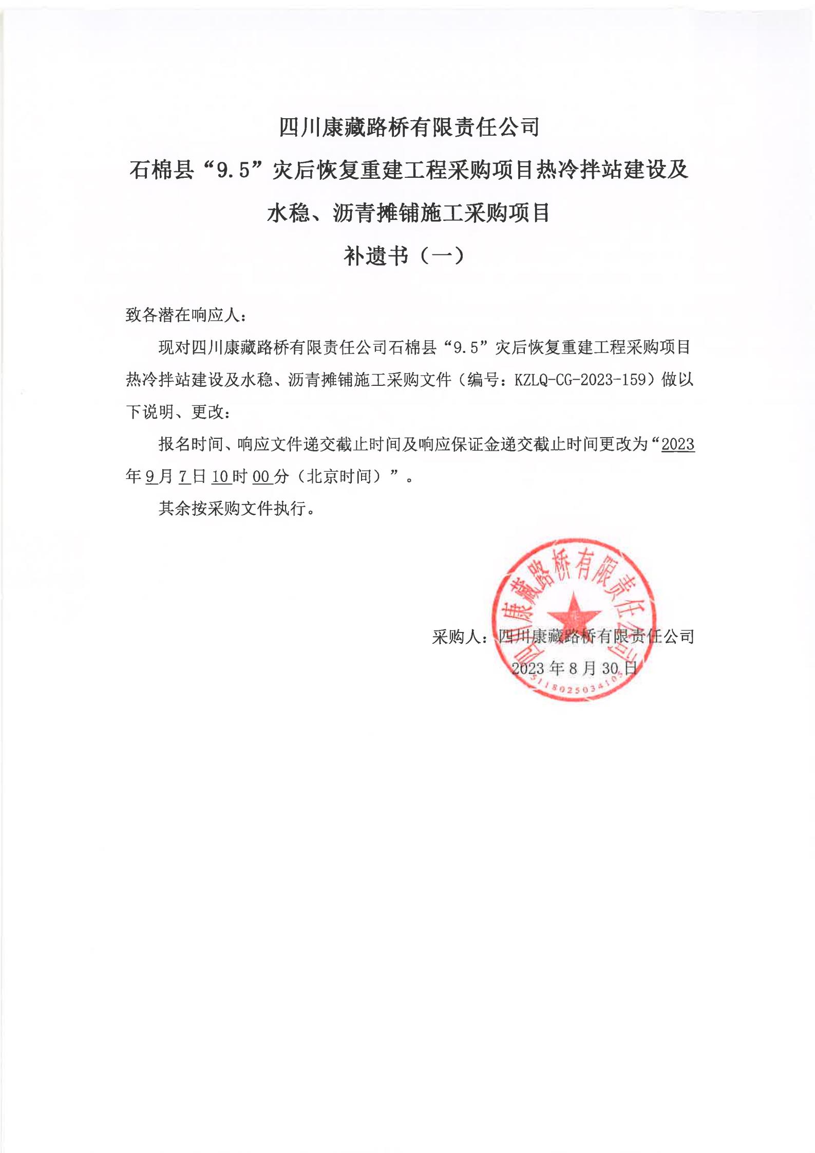 四川康藏路橋有限責(zé)任公司石棉縣“9·5”災(zāi)后恢復(fù)重建工程采購(gòu)項(xiàng)目熱冷拌站建設(shè)及水穩(wěn)、瀝青攤鋪施工采購(gòu)項(xiàng)目補(bǔ)遺書(一)