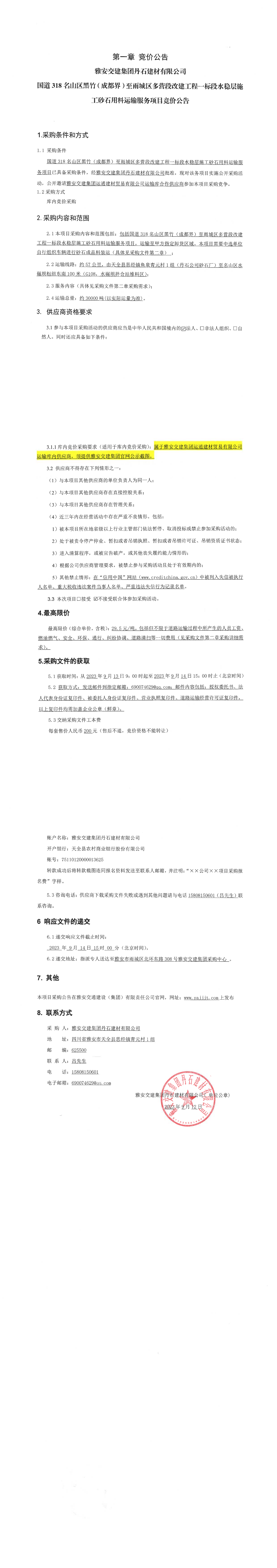 雅安交建集團(tuán)丹石建材有限公司國道318名山區(qū)黑竹(成都界)至雨城區(qū)多營段改建工程一標(biāo)段水穩(wěn)層施工砂石用料運(yùn)輸服務(wù)項(xiàng)目競(jìng)價(jià)公告