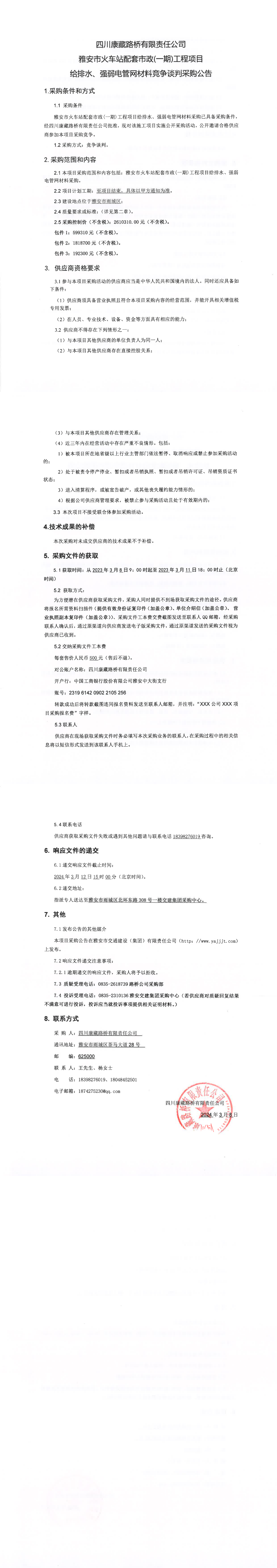 四川康藏路橋有限責(zé)任公司雅安市火車站配套市政(一期)工程項(xiàng)目給排水、強(qiáng)弱電管網(wǎng)材料競爭談判采購公告