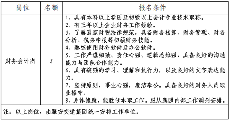 根據(jù)發(fā)展需要,決定面向社會(huì)公開(kāi)招聘雅安市交通建設(shè)(集團(tuán))有限責(zé)任公司(以下簡(jiǎn)稱“雅安交建集團(tuán)”)所屬子公司財(cái)務(wù)工作人員5名,現(xiàn)將有關(guān)事項(xiàng)公告如下:
