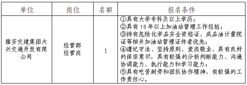 根據(jù)發(fā)展需要,決定面向社會(huì)公開(kāi)招聘雅安市交通建設(shè)(集團(tuán))有限責(zé)任公司(以下簡(jiǎn)稱“雅安交建集團(tuán)”)所屬子公司工作人員1名,現(xiàn)將有關(guān)事項(xiàng)公告如下: