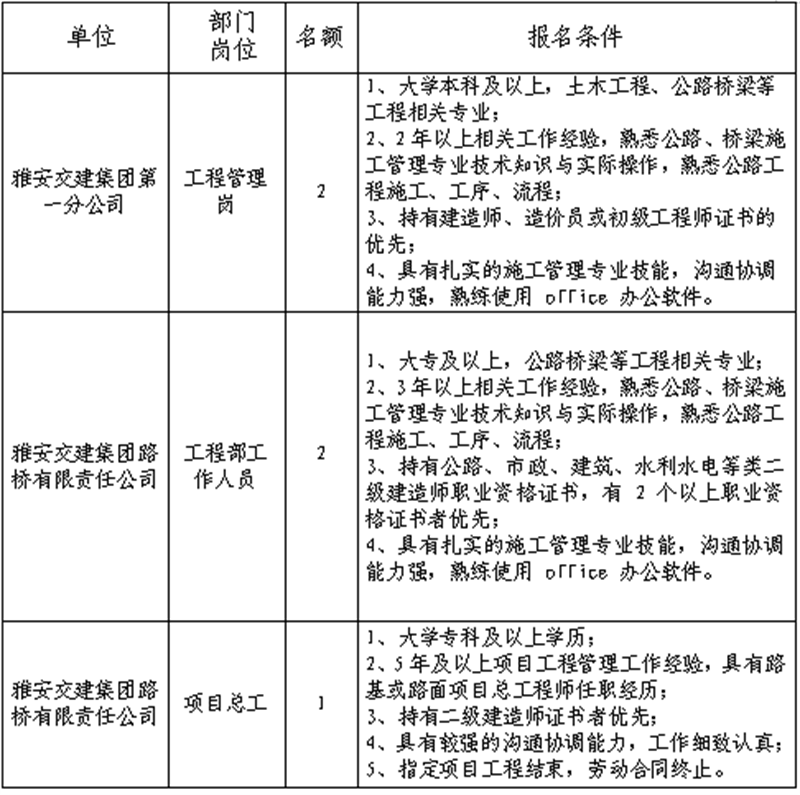 根據(jù)發(fā)展需要,決定面向社會公開招聘雅安市交通建設(shè)(集團)有限責(zé)任公司(以下簡稱“雅安交建集團”)所屬分子公司工作人員5名,現(xiàn)將有關(guān)事項公告如下: