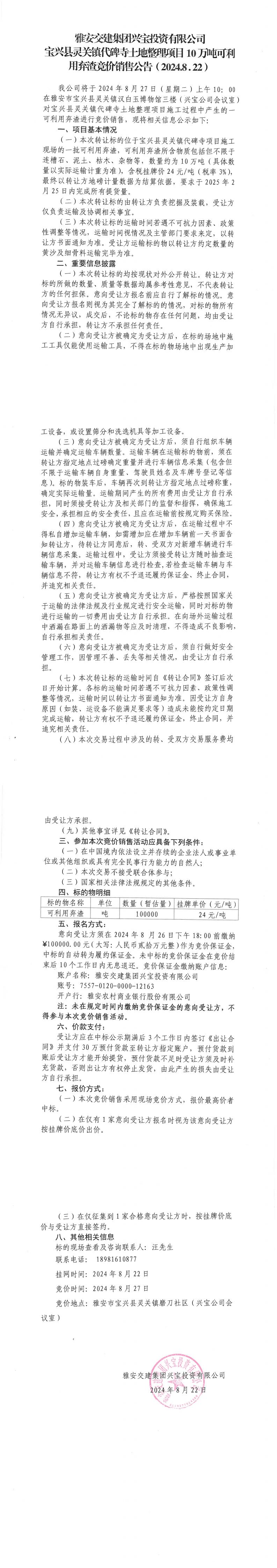 雅安交建集團(tuán)興寶投資有限公司寶興縣靈關(guān)鎮(zhèn)代碑寺土地整理項(xiàng)目10萬(wàn)噸可利用棄渣競(jìng)價(jià)銷售公告(2024-8-22)_0